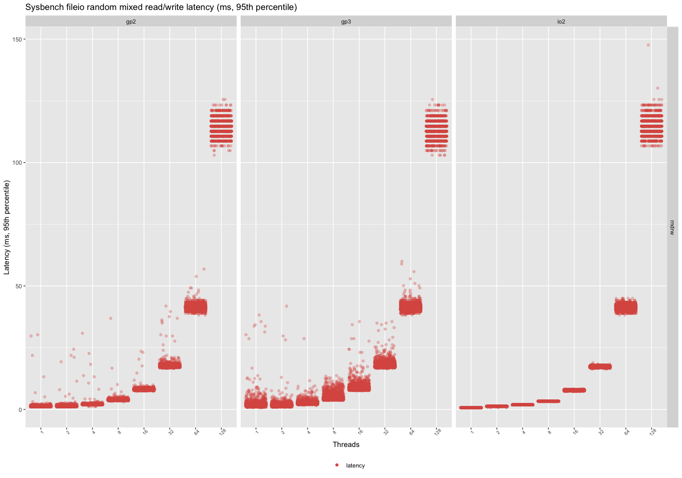 The TPCC benchmark uses 16 threads for a duration of 2 hours. The duration is sufficiently long to allow for a steady state and to exhaust the storage burst capacity. Sysbench returns the total number of TPCC transactions per second every 10s. This number includes not only the New Order transactions but also the other transaction types like payment, order status, etc. Be aware of that if you want to compare these results with other TPCC benchmarks.